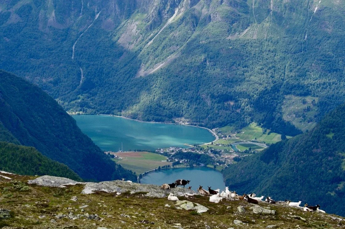 02:25 Departure farm, walk to Skjolden centre via alternate route, stopping at view point overlooking the farm, village and fjord.